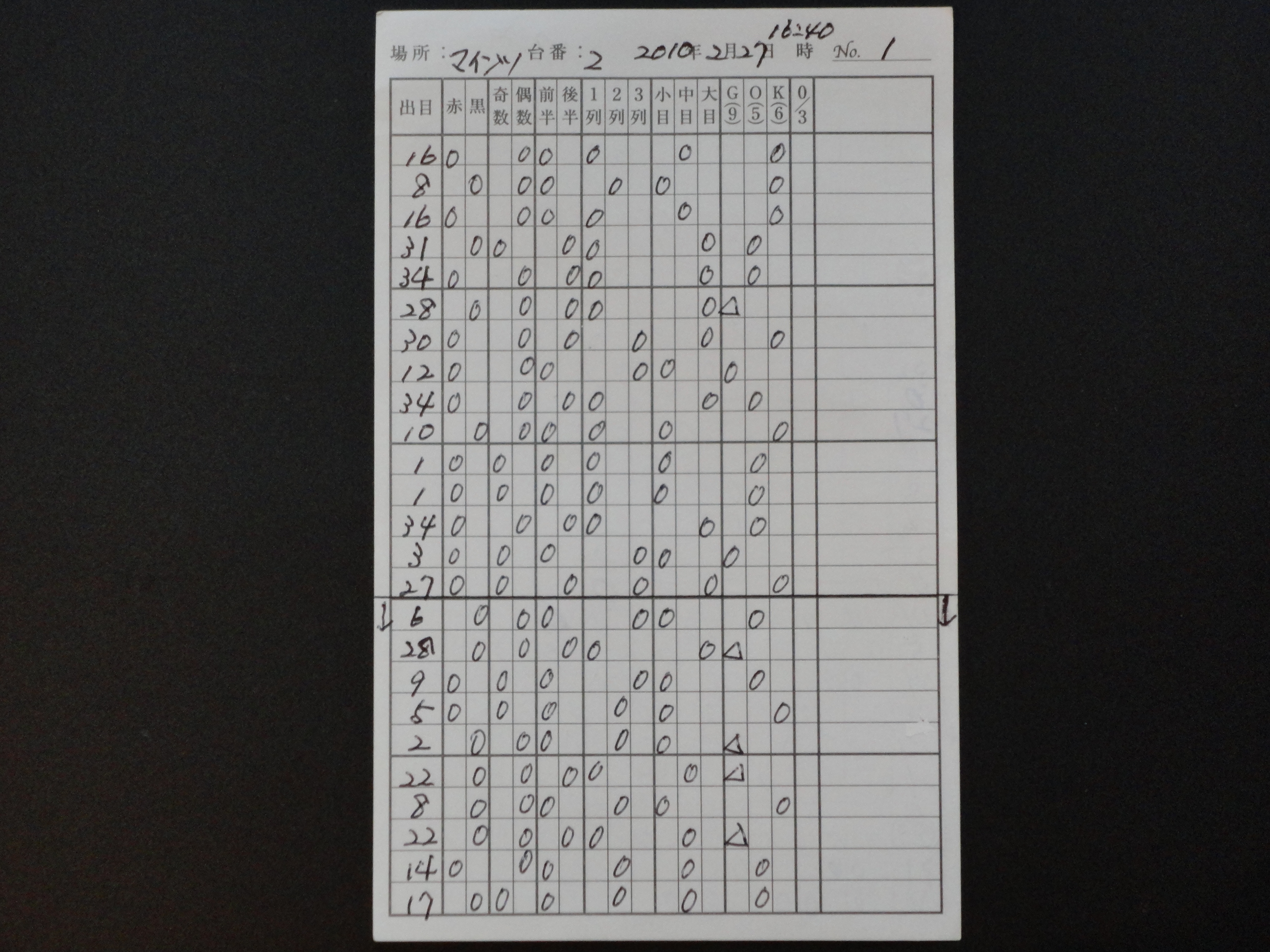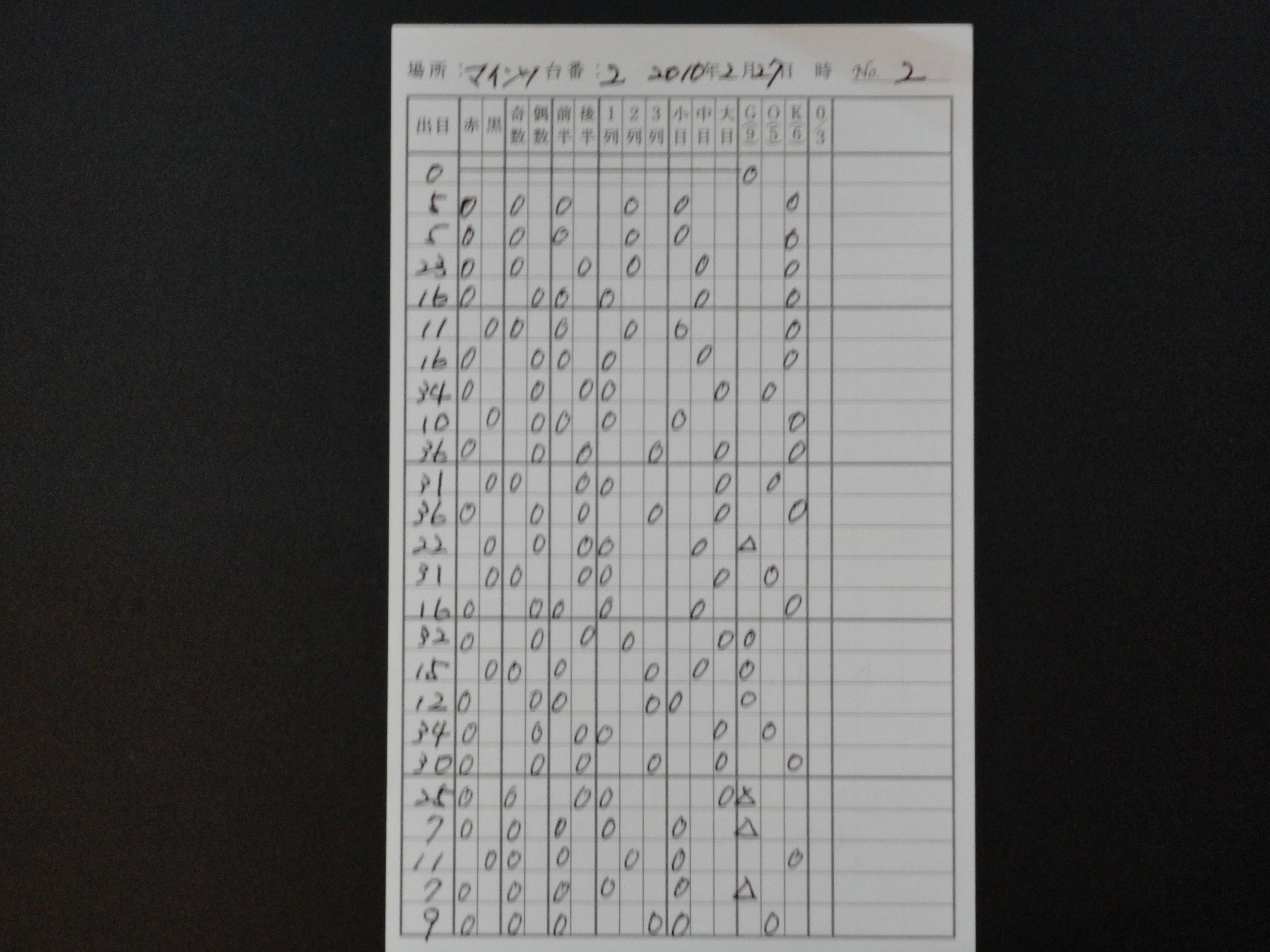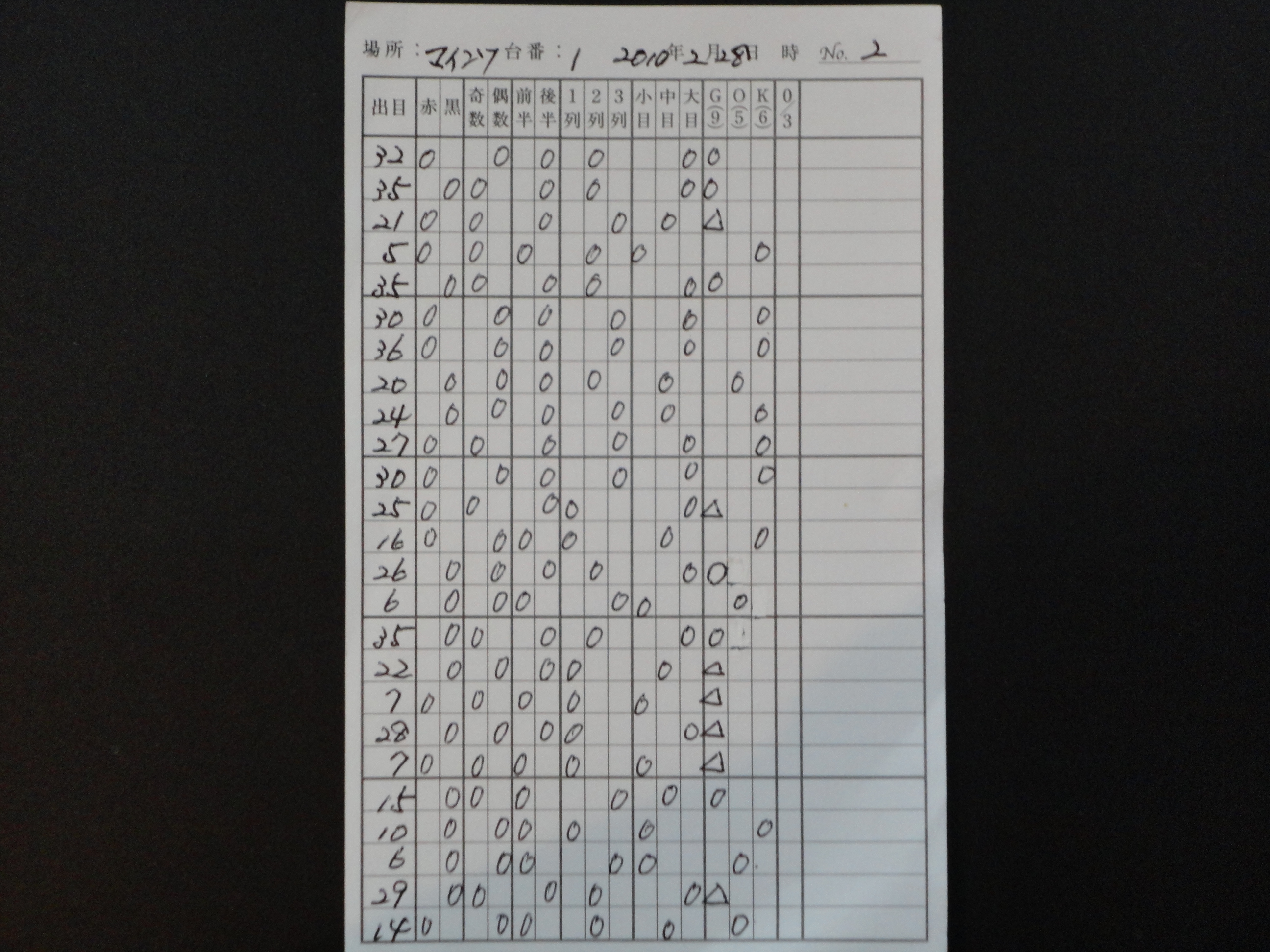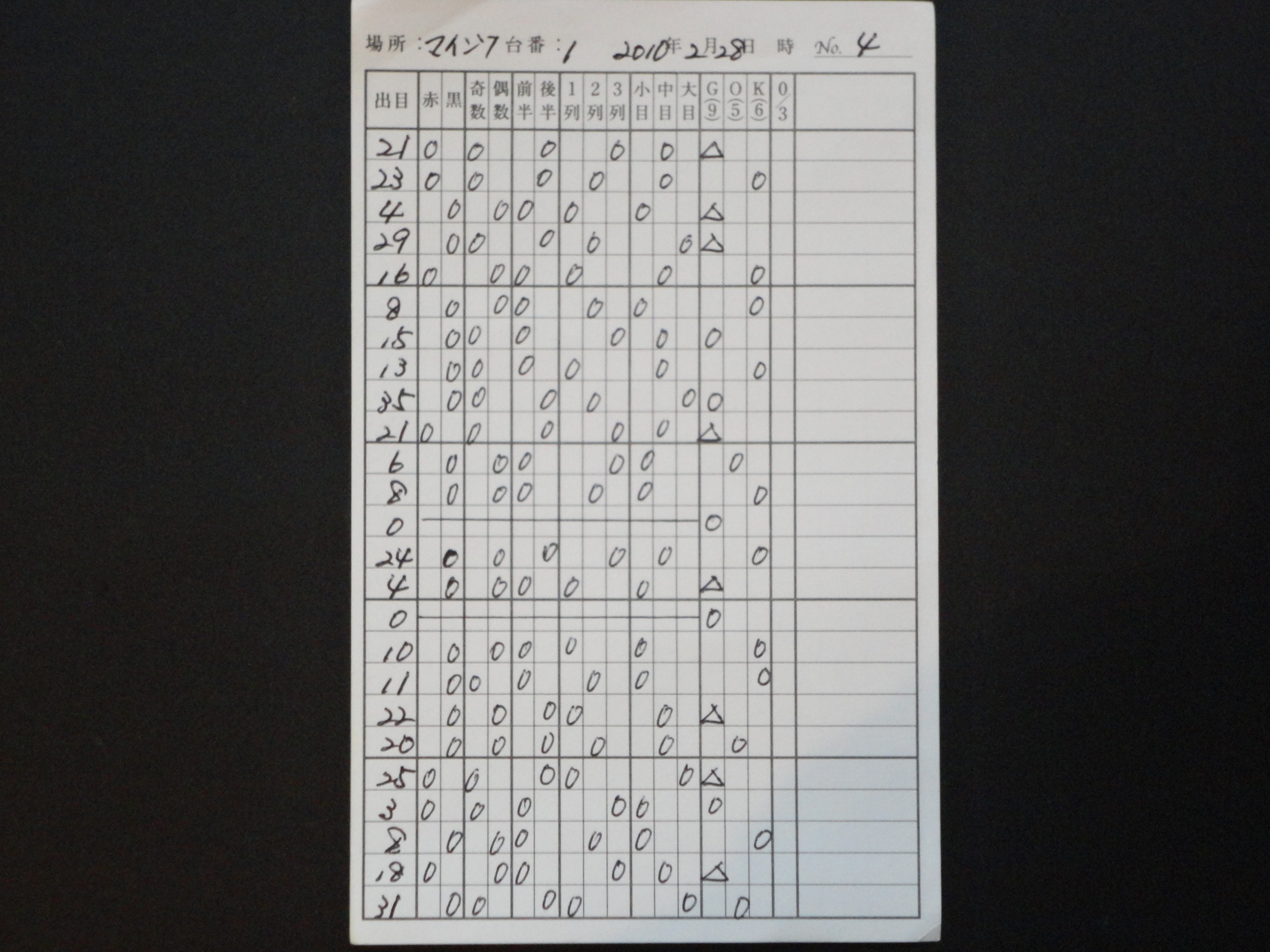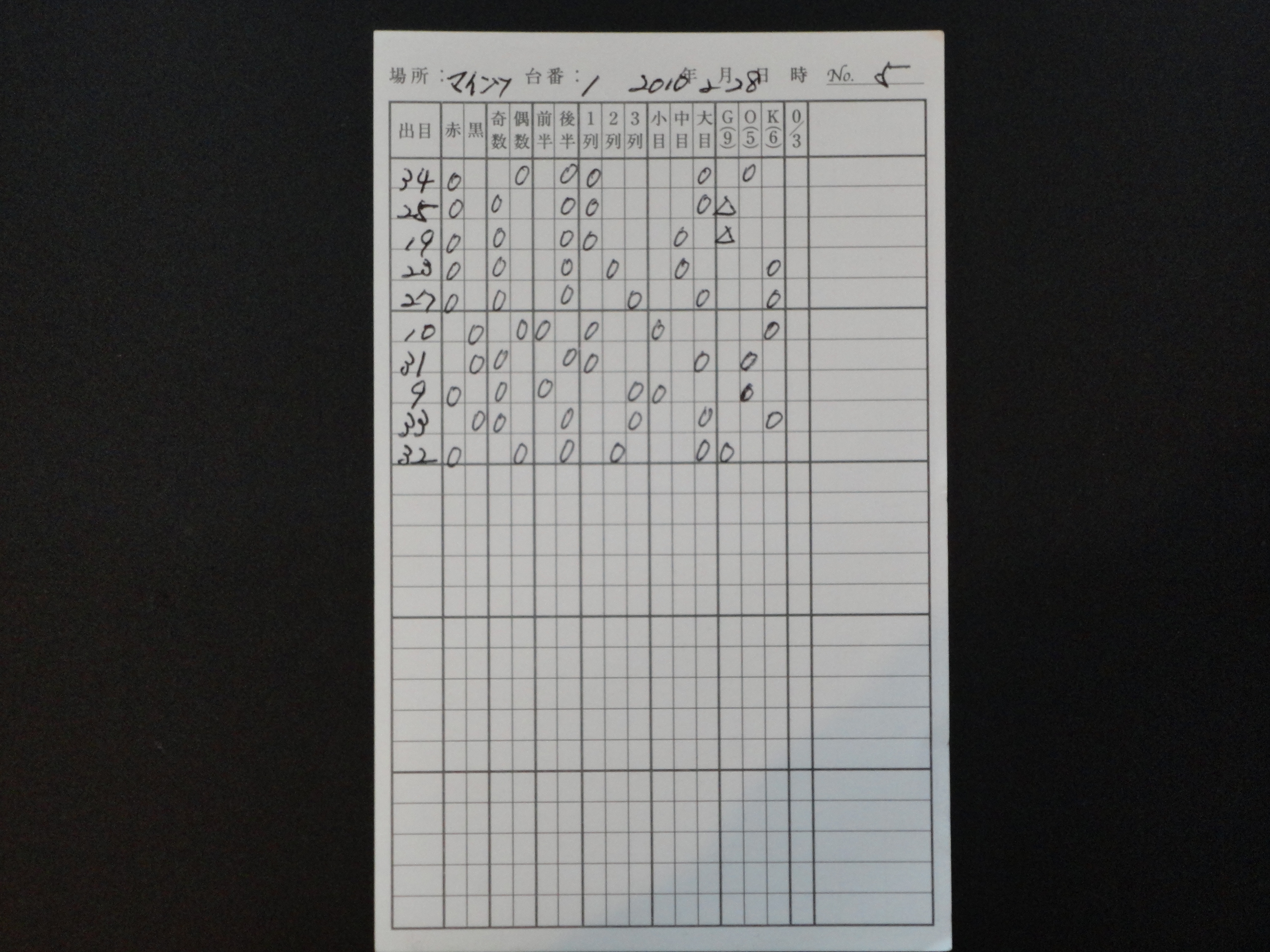 7以前は表示盤から消えてしまっているのでわかりませんが、どうやら遅れて来たのは不幸と出たようです。いつもの掛け方ですと、27の次の30では121枚、その次の30でも121枚、さらに次の33では51枚が取れているはずです。いずれもKの大のライン、集中して狙う数字です。この出目に出会えなかったのは、残念としか言えません。