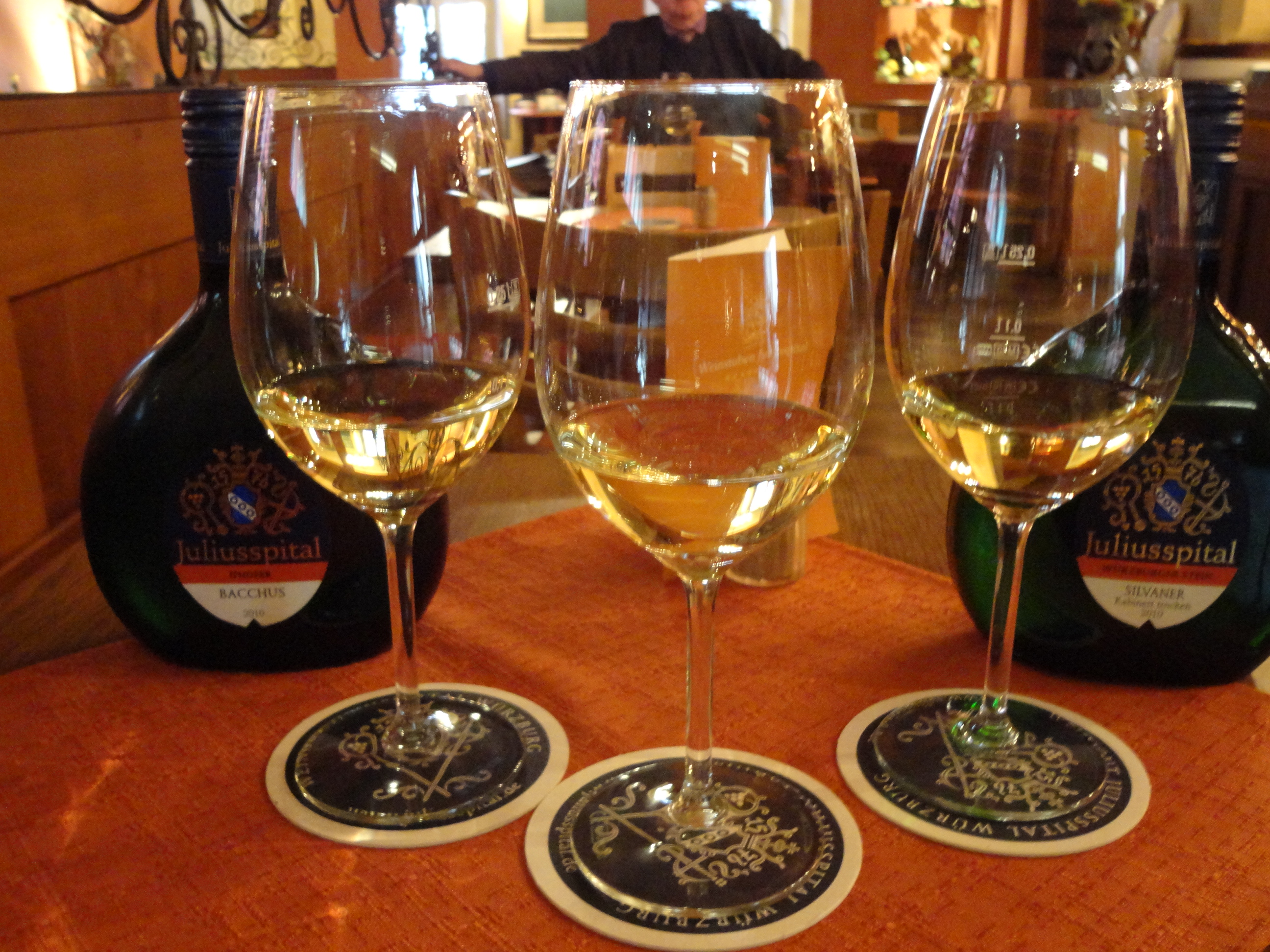 テーブルのほとんどは、予約の札が置かれています。日曜のブランチなのでしょう。このワインレストランでは、施療院が運営するユリウスシュピタール醸造所の直営ということもあって、自慢のフランケンワインを10種類以上、100ccで試飲することが出来るのです。生産の畑とブドウの種類によった組み合わせになっていますが、これはなかなか楽しいのです。フランクフルトから1時間余りかけて出かけていく価値は十分にあります。