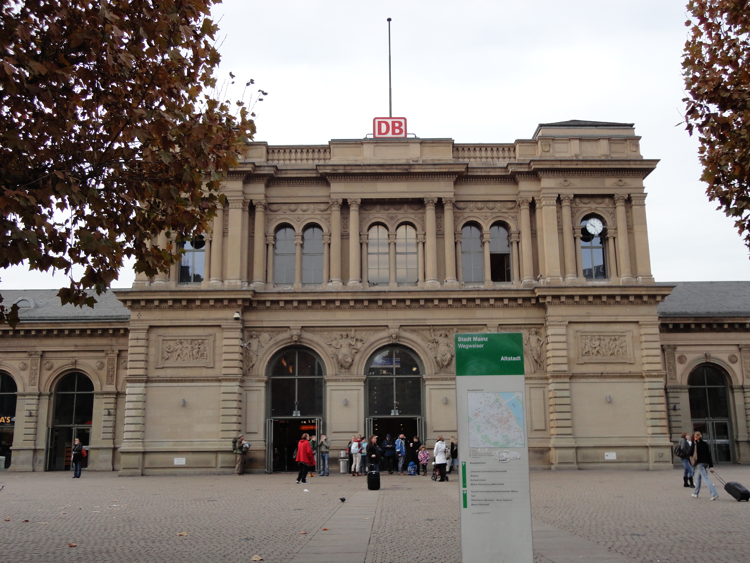 どうも、先程から吹いている突風に原因があるようです。フランクフルト中央駅からここまでの列車がだいぶ遅れたのもこの風のせいのようです。雨は降っていませんが、雲はすごい速さで流れ、歩くのもやっとという、ものすごい風が吹いているのです。トラムはこのマインツ中央駅を中心に運行されていますが、橋や坂が多い中を急カーブを切りながら走っているので線路幅も狭く強風には弱そうです。