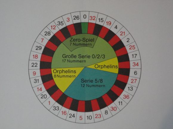 一般的に、0を含めて37数字の盤面は大きく3つのゾーンに区分される。盤面の中心の数字は0でなく左隣の26だが、この26と左右8数字ずつの合計17数字はG(グロース)、26の反対側の12数字はK(クライン)、そしてGとKに挟まれた左右合計8数字はOr(オフラン)の3ゾーンである。筆者はこの内のGを2つに分けて、26を中心にして左右3数字ずつの合計7数字を0/3(ゼロ・スピール)、その外側の10数字(19-4-21-2-25、28-7-29-18-22)を△の印で表すゾーンとして捉え、全体を4ゾーンとして区分している。