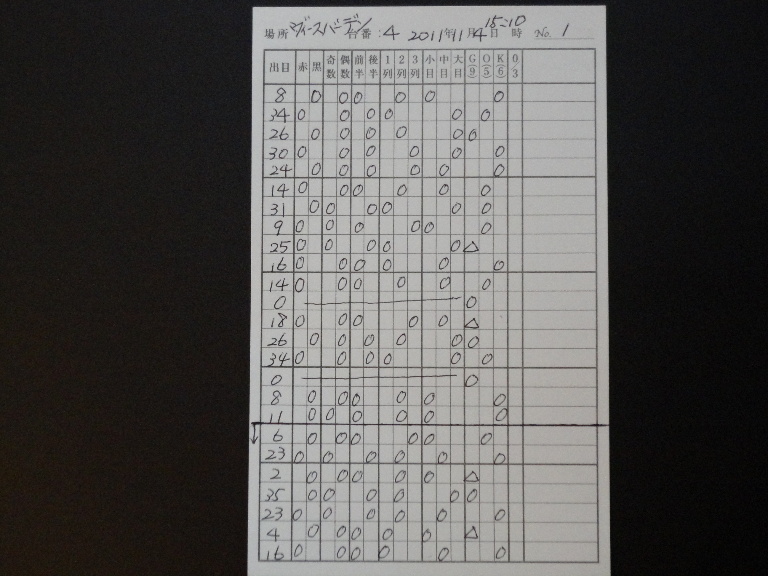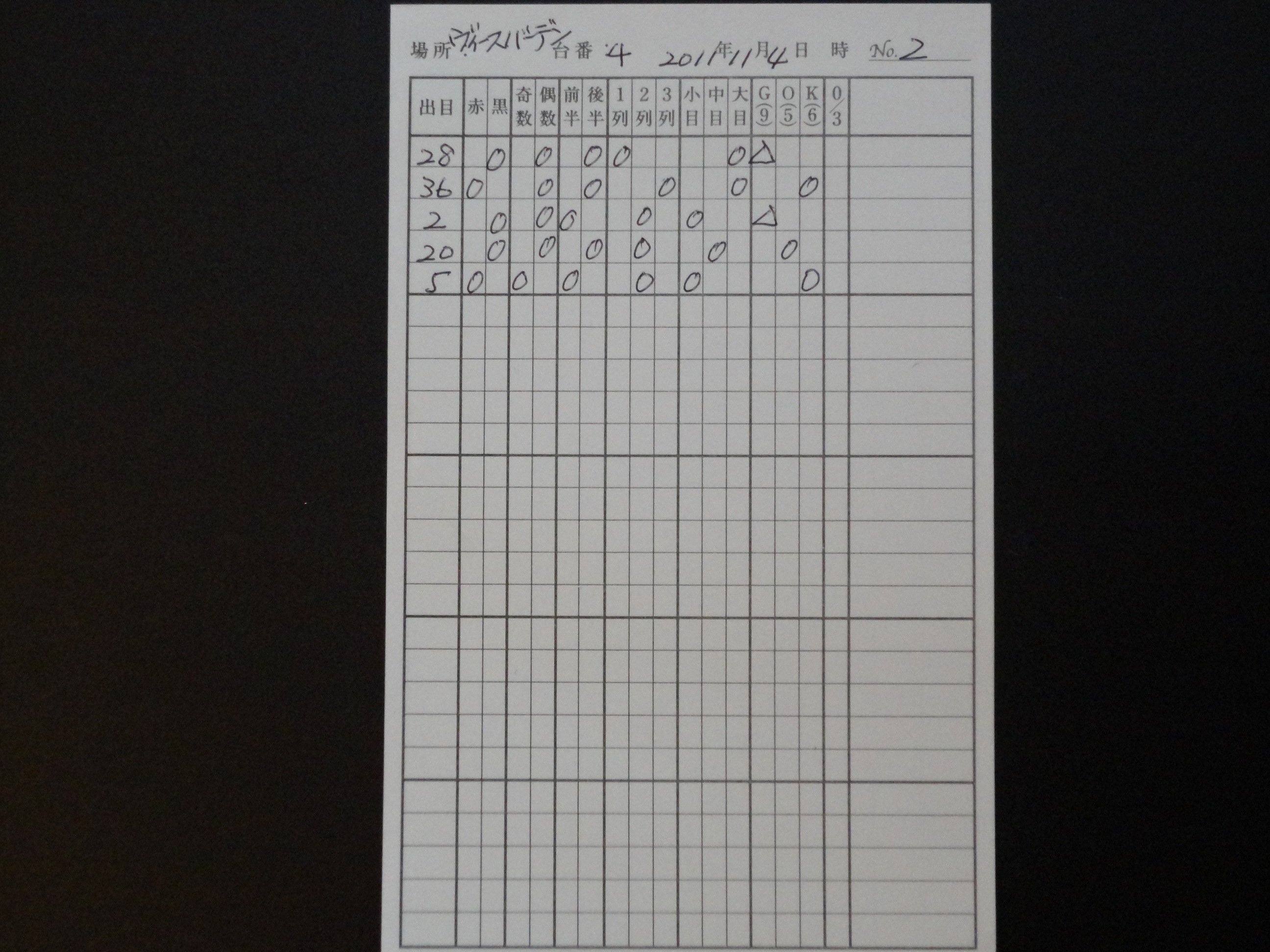 この内、28は△(22・18・29・7・28・19・4・21・2・25の10数字…グロースセリーの17数字からゼロ・スピールの7数字を除外したもの…△での表記は筆者独自のもの)とKが交互に出ていることから、△ゾーンの中で目の流れに合わせた大(25~36)に該当する数字の25、28、29の3数字に集中して賭けてうまくいったもの。