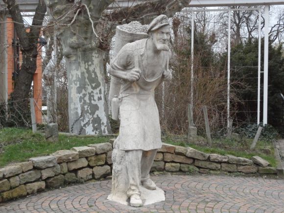 ブドウの取り入れで働く農夫か季節労働者の像。クアハウスと隣の教会との間に建っているが、この町がラインヘッセンのワインの産地であることを示している。