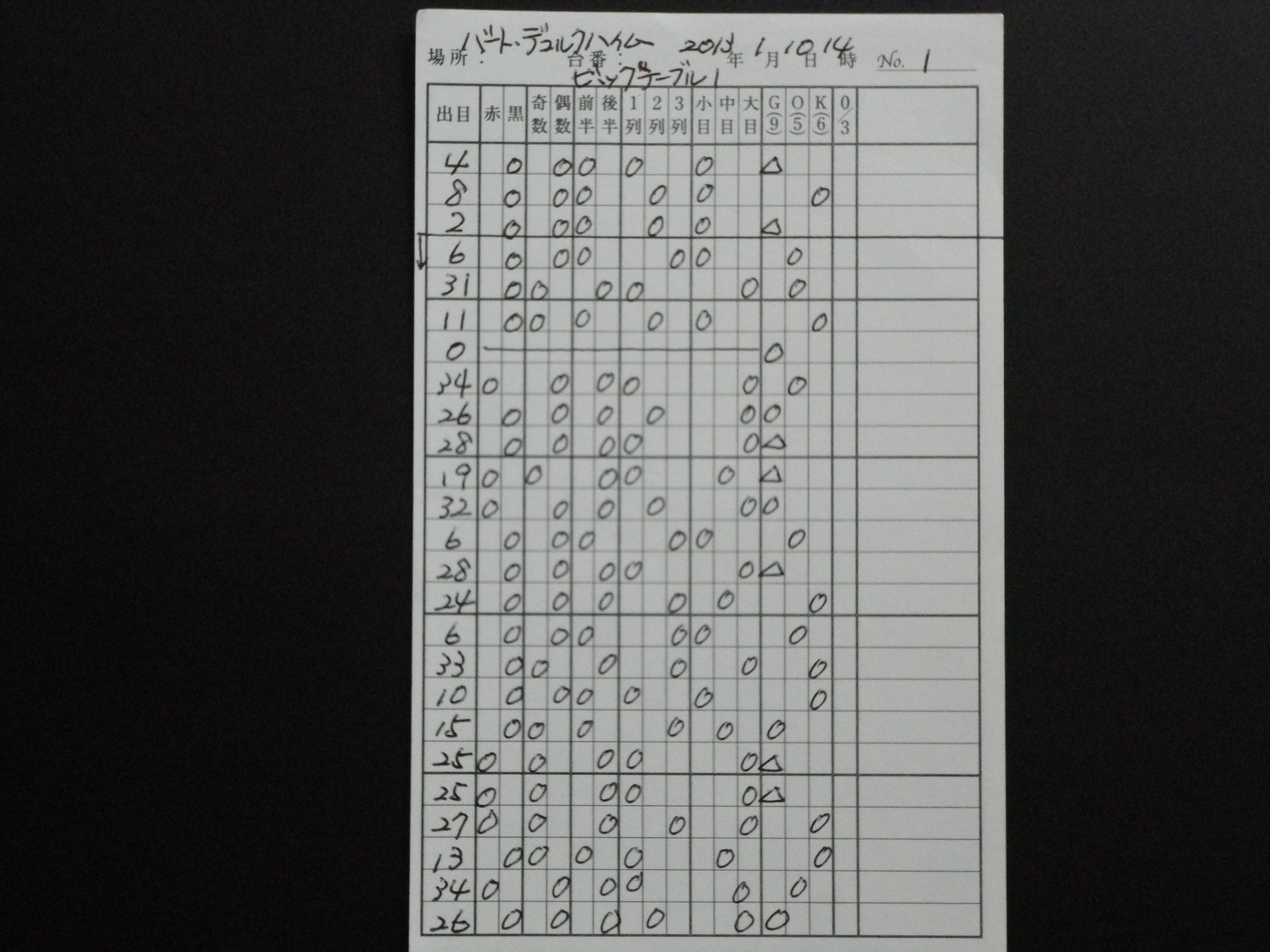本来はオープンから15投くらいまでは賭けずに見(けん)をして、出目を持参の出目表に写し取り出目の傾向をケイ線で見ていなければいけないのだが、1投目は4、2投目は8、3投目は2と立て続けに小が出た。これに誘われてバーコーナーでコーラ(筆者はカジノでのプレイ中はアルコールは飲まない)を飲んでいたが、思わず立ち上がってしまったのは、正月早々だったからか修行が足りないからか。
