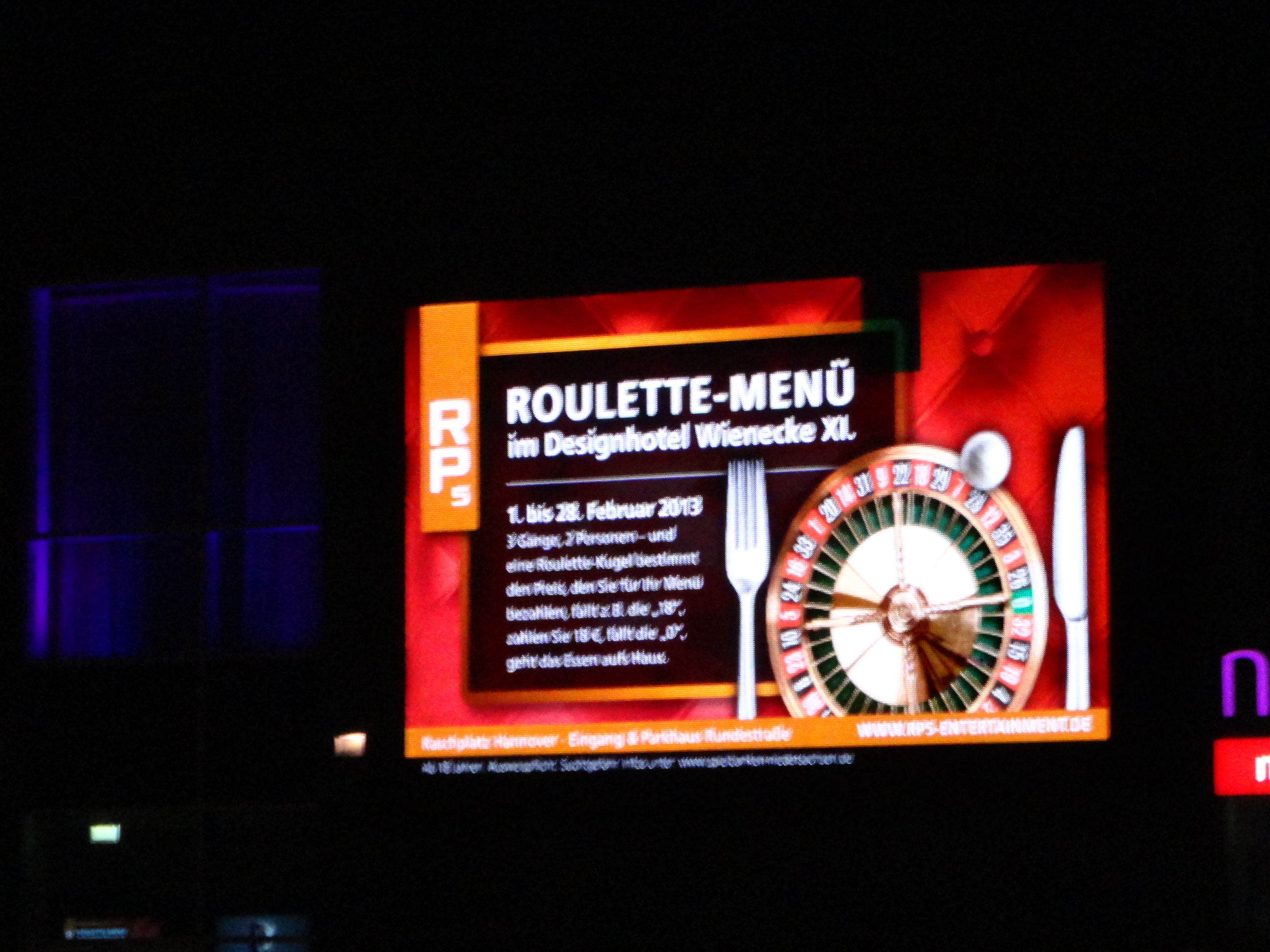 ハノーファーのカジノは、以前は街の南側のマッシュ湖の風光の良い湖畔にあったが、近年、中央駅北口の真前の複合施設ビルの1、2階に移転した。ドイツの多くのカジノの中でも駅の真前の立地というのは珍しい。これはドイツのカジノの経営の状況の変化に起因しているようである。30年以上前のドイツのカジノの最盛期と比べると、どこのカジノも賭け人の数が大幅に減ってきている。