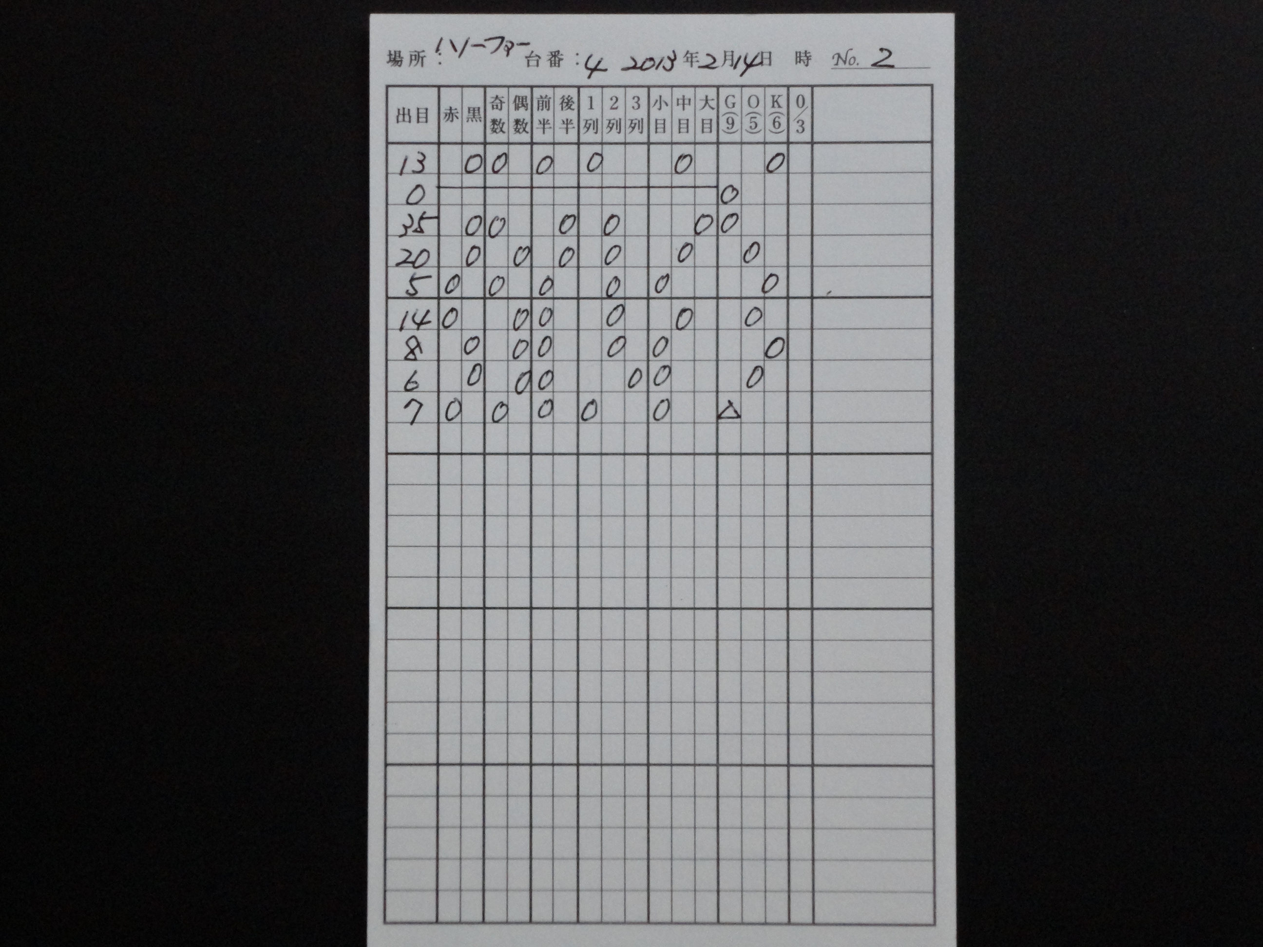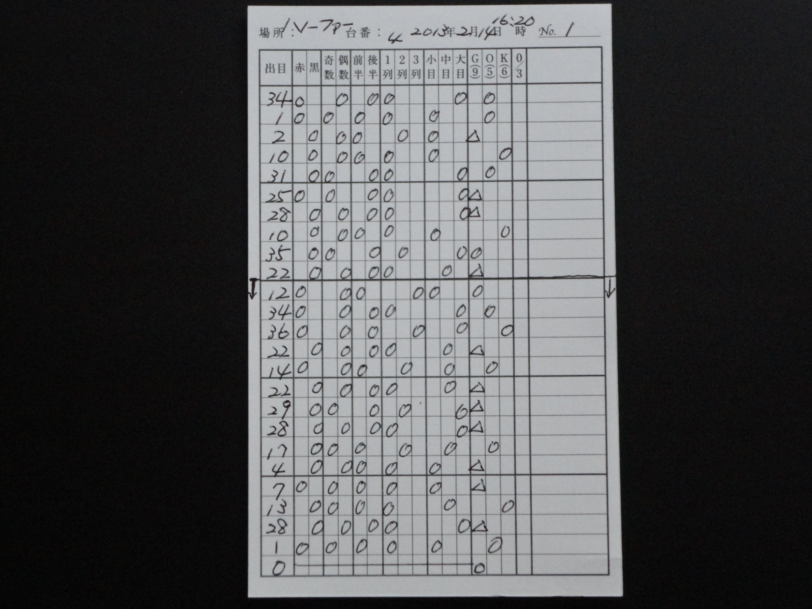 G(ウィールの数字配列で、盤中心の26の左右8数字ずつ合計17数字のゾーン)の中でも、0/3(ゼロ・スピール…26を中心として左右3数字ずつの7数字のゾーン)を除外した10数字(筆者は△マークでこの10数字のゾーンを表わしている)に寄って来ているのに対応できず。ところがその後、△の流れを生かしたところ、