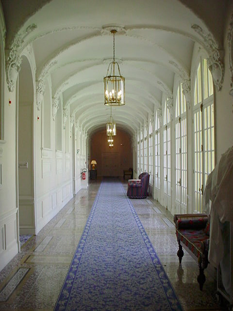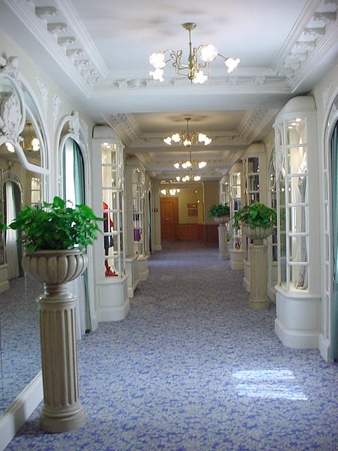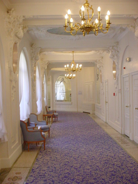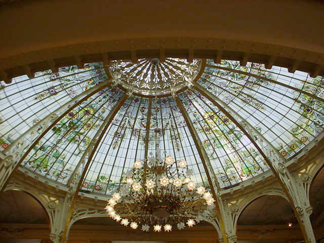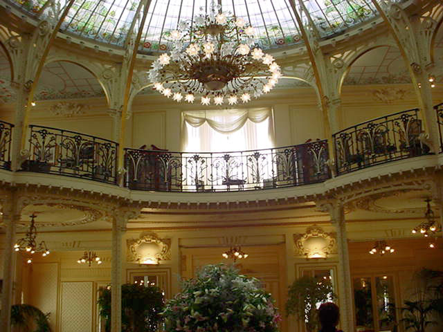 とにかくフロントから部屋に入るまでの廊下を歩いていも別世界。口では説明できないので、とにかくしたの写真をご覧ください。とくに、中央下の写真はあのエッフェル塔を作ったエッフェルのよるステンドグラス式天蓋。白とマリンブルー、そしてゴールドで構成された空間は、そこに存在する人を選ぶような空気があるのは間違いないです。