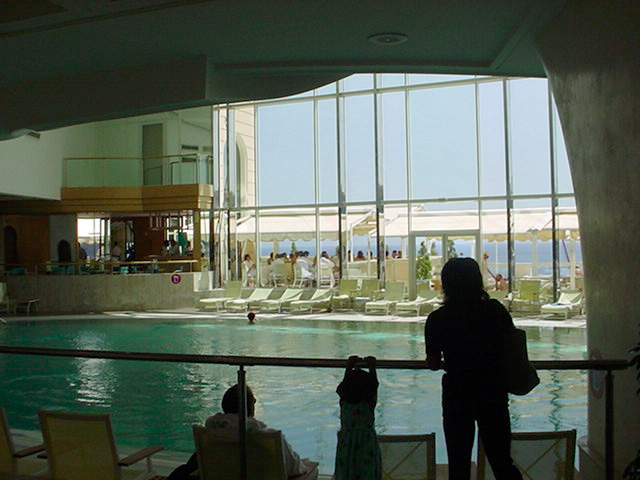 続いて部屋の中。いい写真がないのでわかりにくいですが、スタンダードの部屋でもゆうに50?は超える広さです。写真はありませんが、お風呂と洗面所だけで30?はあろうかという広さ。ぼくが今まで見た中ではナンバー1の広さでした。もちろん海に面したバルコニー付。なんといってもここから見える風景がエルミタージュの最大の売りですから。ちなみに右下の写真は、併設されているテルメ。30℃の海水プールにボーと浸かってるばあさんだらけでした。