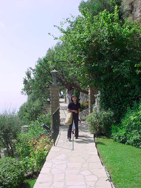 で、ホテルの中に入ります。しかし、フロントまでなんと遠いこと。下の写真は、そのフロントまでの通路の一部分です。断崖絶壁や庭園、細い路地をくぐり抜けて5分ぐらいたってようやくフロント到着です。