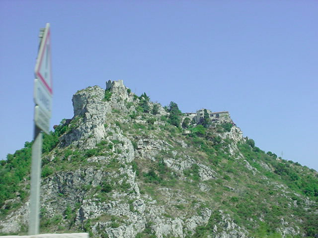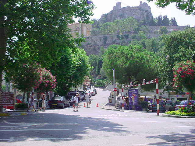 さて、今回のお目当てのひとつ、エズ村のシャトー・ド・シェーブルドールに到着です。村の入口は幹線に面していて、公営駐車場、レストラン、土産物屋、バス停などがあります。写真にもあるように、この上へは徒歩で上がるしかありません。頂上近くにホテルがあるのでけっこうしんどいですね。(荷物はゲートのすぐ上で引き渡します。どうやってもって上がるんやろ?)
