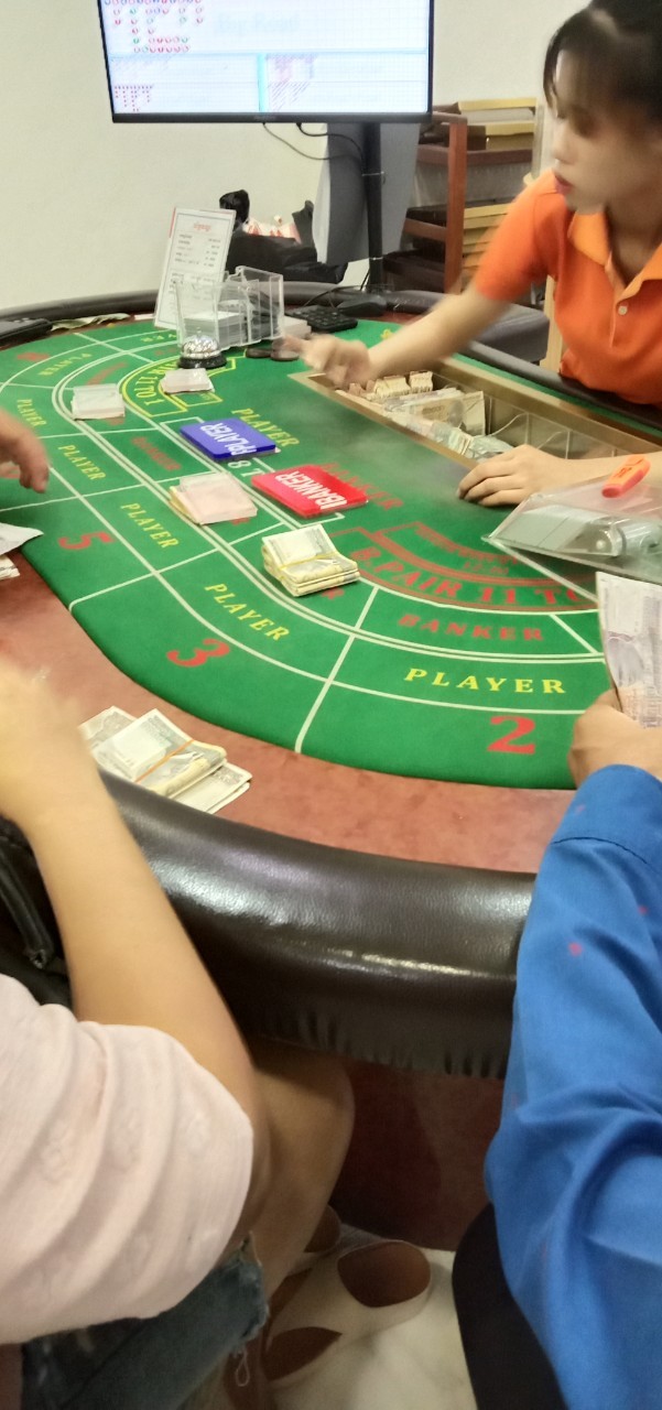 ゲームはバカラ・大小・タイガードラゴン・牛牛それとスロットマシーン。すべてタイバーツ、現金掛けです。バカラのミニマムは300Bとポイペトと変わらないけどルールはかなり特徴的でした。