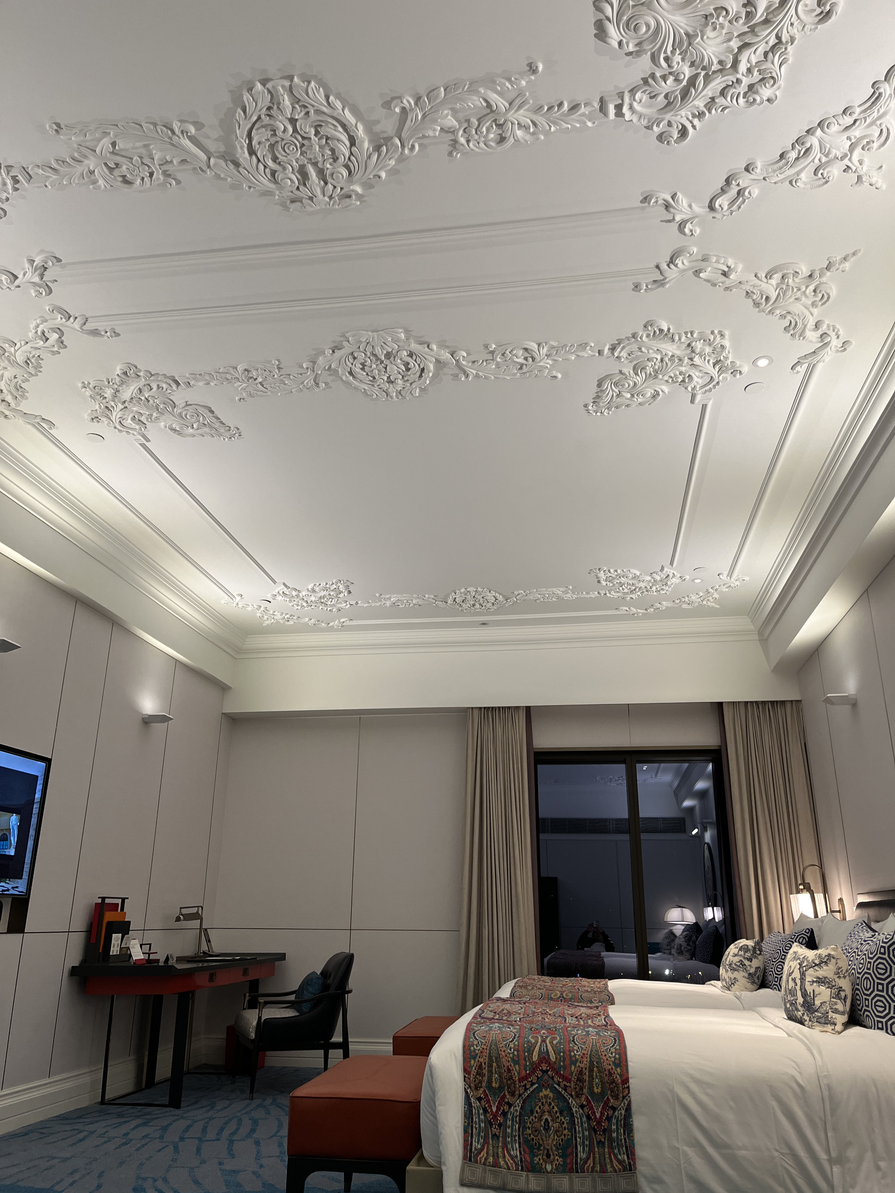部屋は天井の装飾が素敵でした。レインシャワーのヘッドが二つあって水量抜群に良かったです。