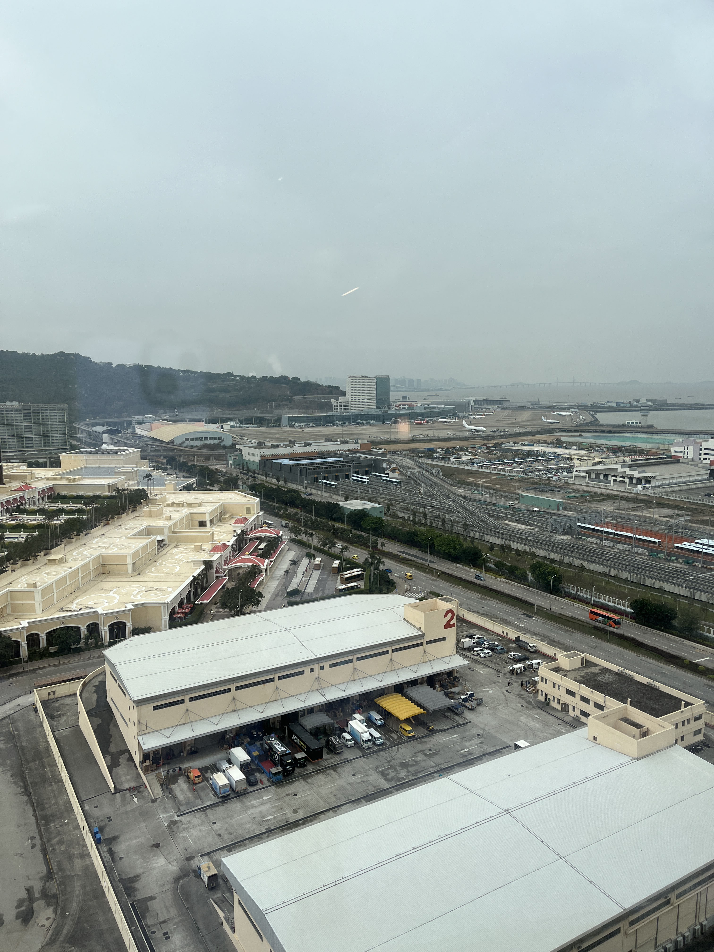 何よりうれしかったのは眺望でした。ストリップ側とは逆なので一般的には外れなのかもしれませんが、空港とLRTの車両基地、港珠澳大橋が一望できて、乗り物好きの私としては大満足でした。