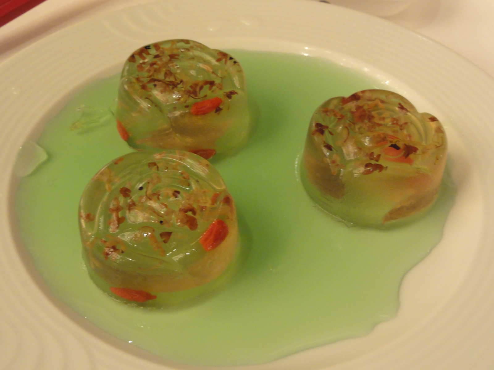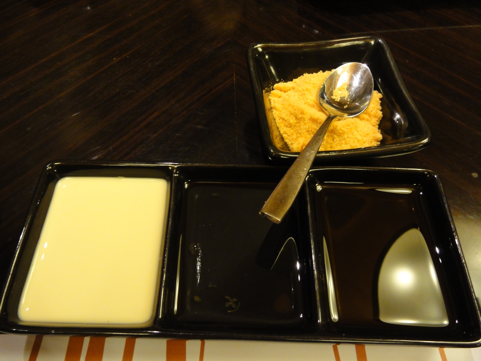 デザートに暖かいお豆腐です、味は付いて無いので自分で調整して食べましょう、KENさんからお豆腐は体の中の火を冷やす効果が有るので良いそうです、薬食同源思想ですね。