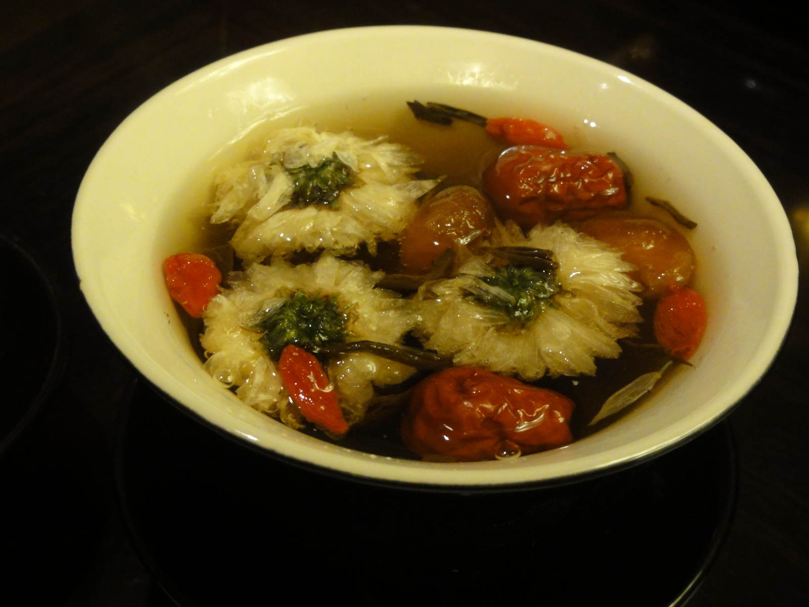 八宝茶(バーバオチャ)をお願いしました、菊の花・クコの実・龍眼等など入った健康茶です。