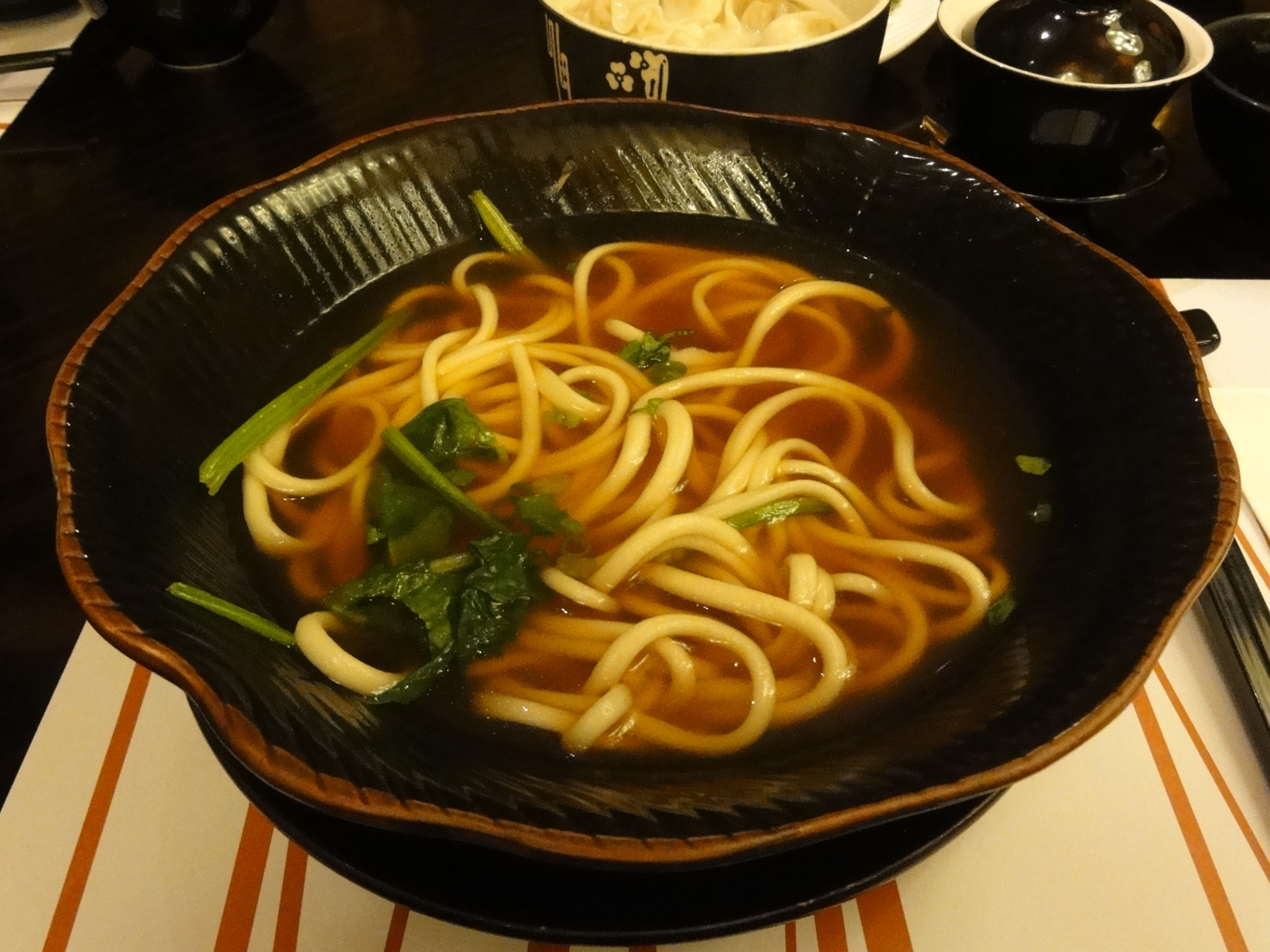 麺類の注文は、麺の種類とスープとサイドメニューを選びます。写真付きのメニューなので注文はしやすいです。今回お願いしたのは、一本麺・牛肉スープ・ワンタンです。この一本麺、本当に一本ですお店のお姉さんに切ってもらいました。