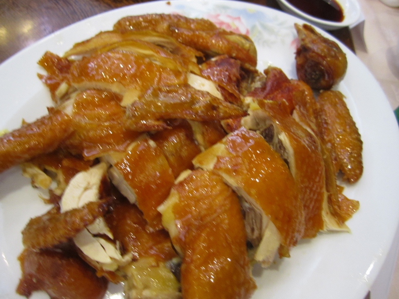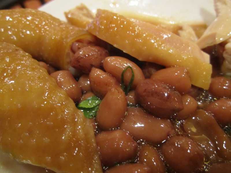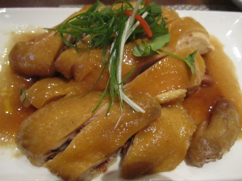 鶏肉に熱い油を振りかけて振りかけて熱を通していきます。