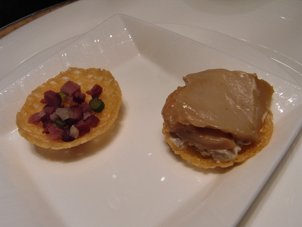 まずはアミューズ・グールです。得意の鴨とアワビです。カモはミンチです。食事の最初のパートとして、意外に大事なのです。その店の個性や得意技がさりげなく出されることが多いです。もちろん満足です。ワクワク感が高まります。