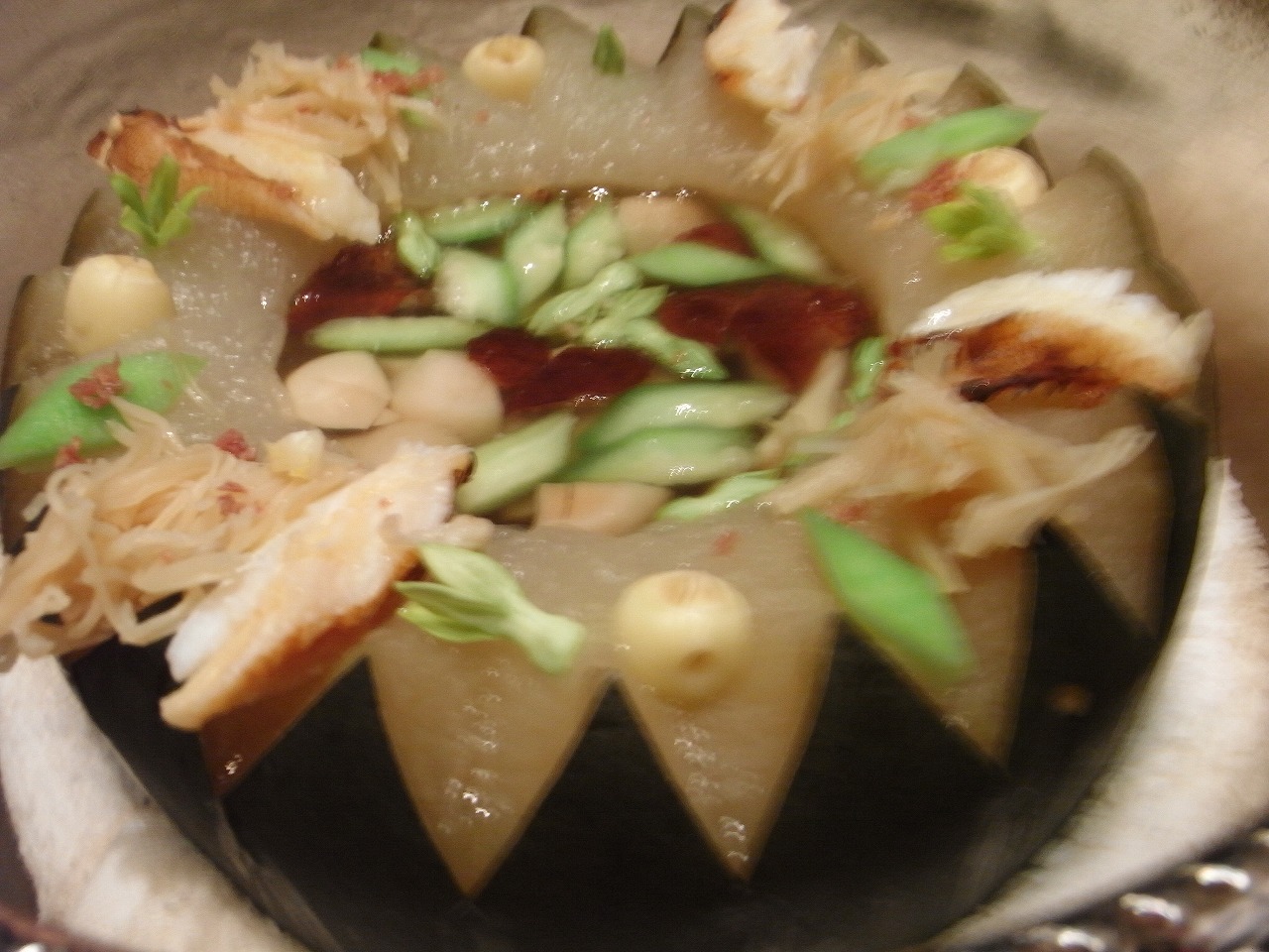 冬瓜のスープも古典に入る料理で、旨みや滋味がすべて器の冬瓜に閉じ込められているため、