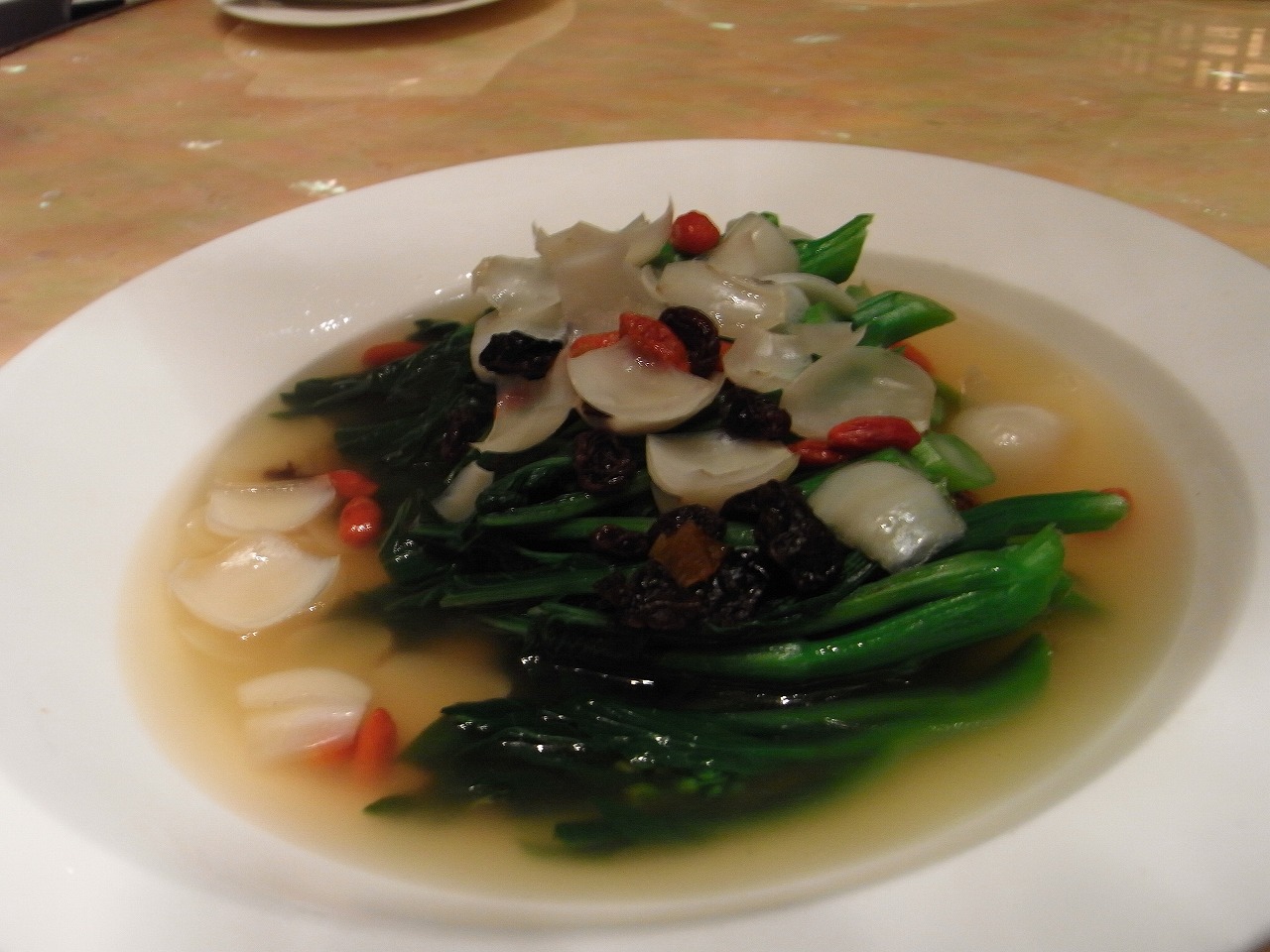 野菜もとらないとバランスが悪いです。百合枸杞浸時蔬。百合根とクコの実の入った野菜のひたひた煮です。これも体によさそうです。クコの実の赤が彩りを加えています。この野菜は香港やマカオでよく食べられていますが、浸し煮にしてあるので、やわらかく、お年寄りにもよさそうです。
