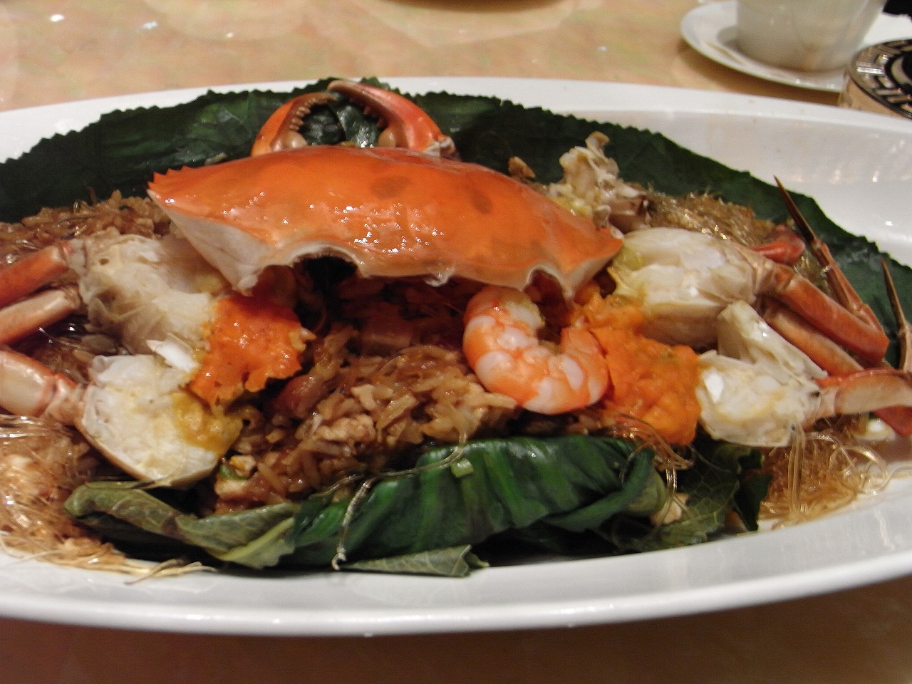 魚翅膏蟹鮮蝦荷葉飯。マカオではブルークラブを1匹まるごと入れて煮込んだお粥が有名です。これはその変形とでもいう料理でしょうか。やはり膏蟹をエビと半端じゃなくたっぷりのフカヒレとともに、はすの葉包みのご飯に仕上げました。はすの葉の香りと、蟹のダシがご飯に移って、旨い旨い。それにこれでもか、のフカヒレが贅沢な食感につながります。これは今までいただいたことのない大ご馳走でした。油彩のように、味と味を重ねた効果がでています。骨太で、とてもいい料理だと思いました。