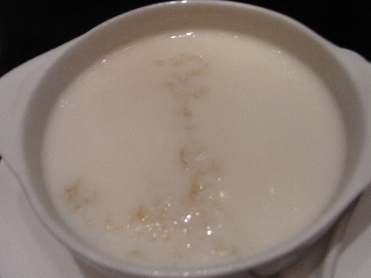 デザートになります。燕液蛋白杏仁茶。燕の巣のアーモンドスープです。燕の巣はウミツバメの巣で、崖に登って取ってこないといけません。ゼラチン質で体にとてもいいです。