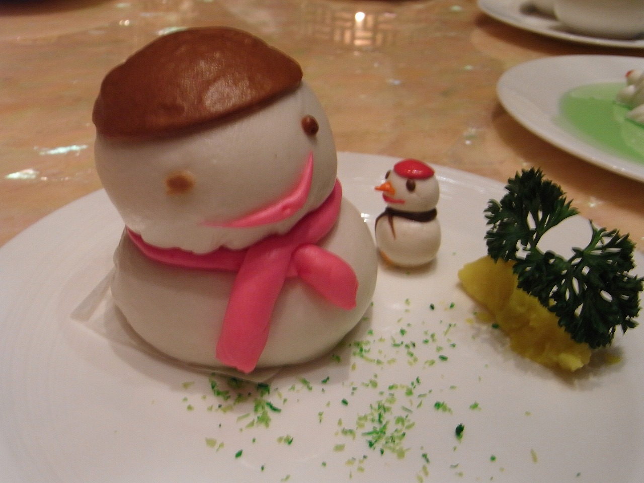 燕液雪人包。雪だるまの点心。これにもカスタードクリームの中に燕の巣が入っています。家族連れには大人気になることでしょう。味もいいです。