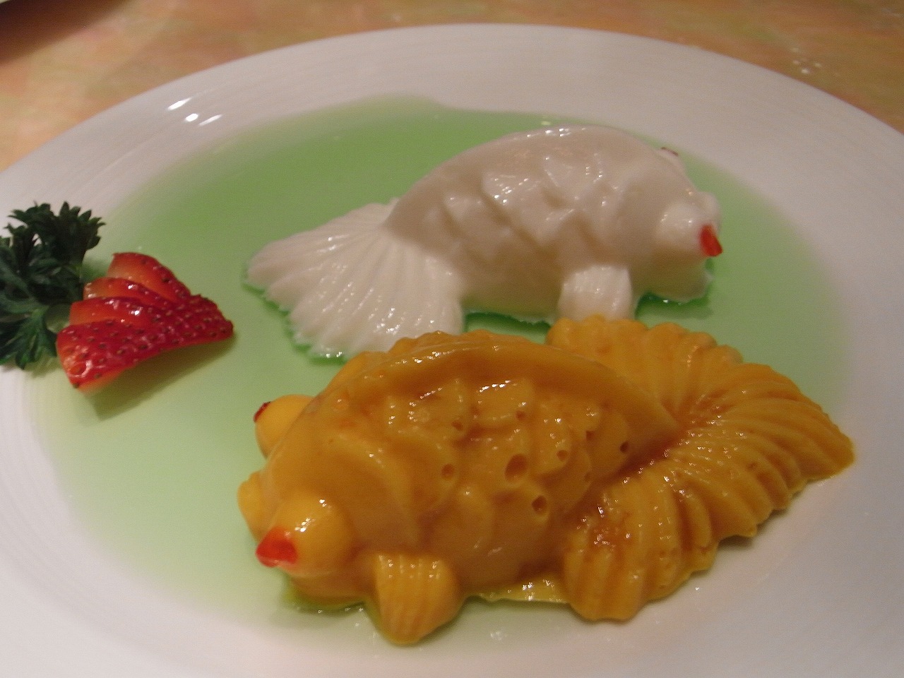 鴛鴦金魚凍。マンゴーとココナッツのプリンです。マンゴー、おいしいです。ソースも濃厚なマンゴーソースですが、それをかけるとさらにおいしくなります。夏らしく見た目もいいですね。鯉でやるのはよく見ますが、「8」らしく金魚にしたところがアイディアです。