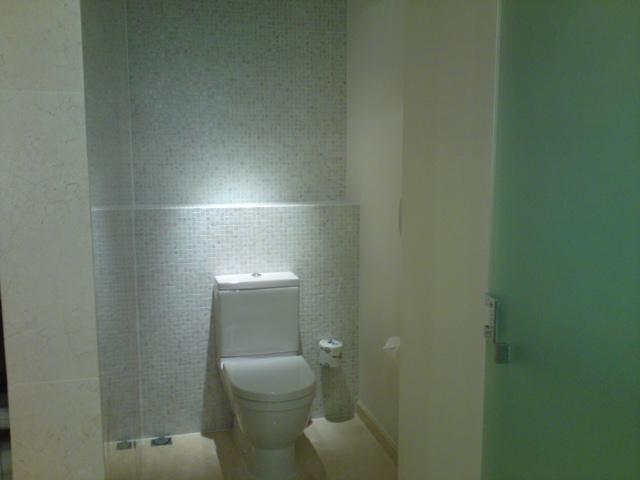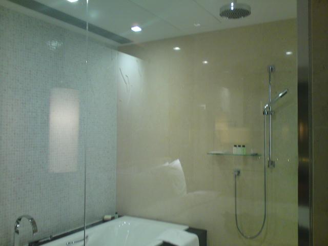バスルームは2つの洗面台、バスタブとシャワーは一緒になっていますが、レインシャワーとハンドシャワーあり、ベットルームから丸見えガラス張りですがスクリーンあり。
