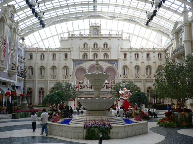 レストランやカジノを繋ぐホテルの中庭部分は巨大なガラス張りのアーケードになっていてポルトガル調の広場になっており、ホテル内を歩いているだけでも楽しめます。
