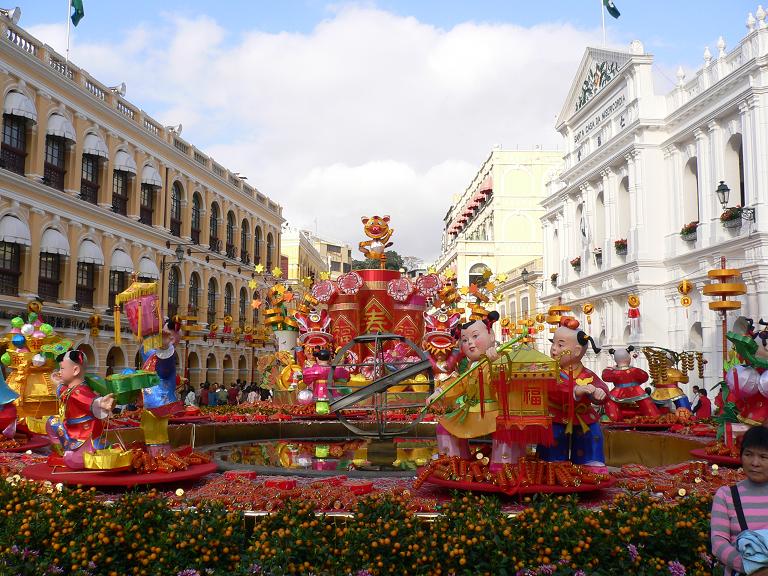 ポルトガル統治時代の面影を残すヨーロッパ風の広場ではありますが、中国の旧正月に近いこともあって広場は旧正月の飾りで派手に飾られ、正月を祝う中国風の民謡が流れていて、西洋が東洋に見事にかき消されていました(笑)。