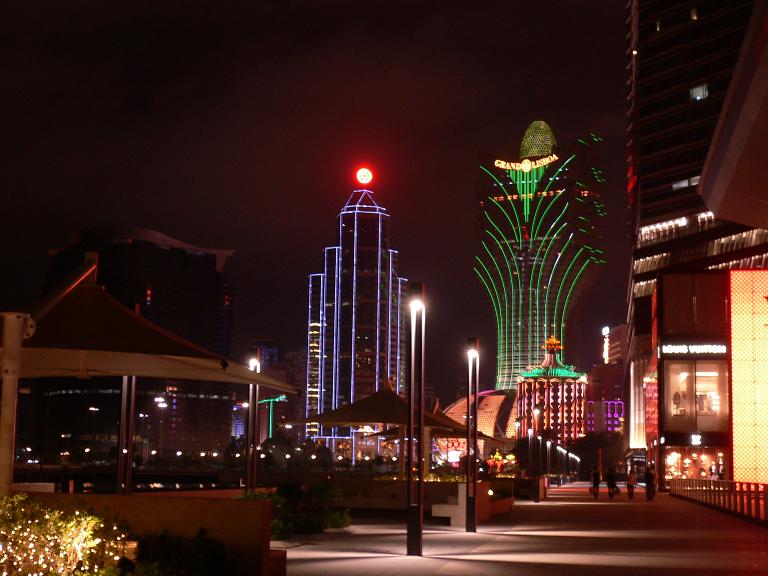 ど派手なネオンで彩られた巨大なカジノホテル群は迫力があり、華やかなマカオの夜の雰囲気を演出しています。WYNNの隣の湖畔に遊歩道があるのですが、そこからグランドリスボアを望む夜景が気に入りました。