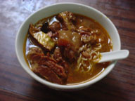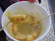 なぜか街の屋台を見るとカレーを使った物がたくさんあります。カレー麺とおでんに挑戦してみました。カレー麺はそのまんまカレーラーメンです。とろとろになった牛のすじ肉が入ってます。その他にも豚、鳥、もあるようです。10ドル程度で、セナド広場近辺で売ってます。おでんは、そこら中にありました。串に刺した様々な具材の中から好きな物を選んで注文すると、スープの中で暖め直し、それを器に入れ、カレーをかけます。海老団子、蟹団子、砂肝、正体不明の臓物類等、具材はいろいろです。