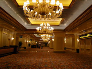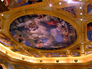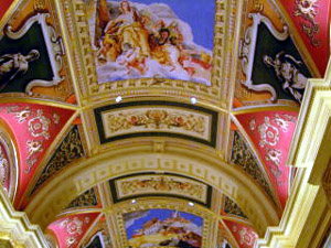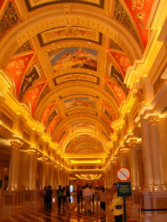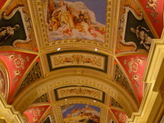 タクシーに乗ってベネチアンのフロントに到着。入ったところがホテルフロント。中の装飾は豪華絢爛。フロントから回廊が続いている。天井には本家のベネチアンと同じく天井画が描かれている。そのまま天井画を見ながら歩いていると気がついたらカジノに入ってしまっていた。