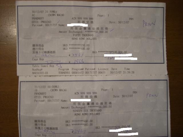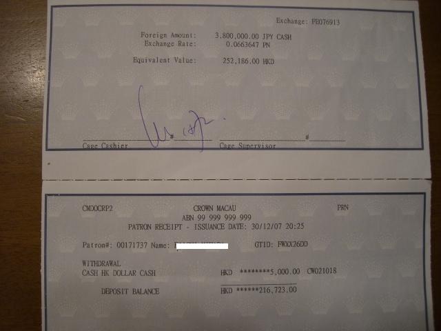写真2:デポジットと最初に5万HKをバイインしたときのレシート