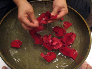 バラの花ビラを洗いい桶の中に入れてくれてレモンと共に洗ってくれます。いたれりつくせりのサービスです。