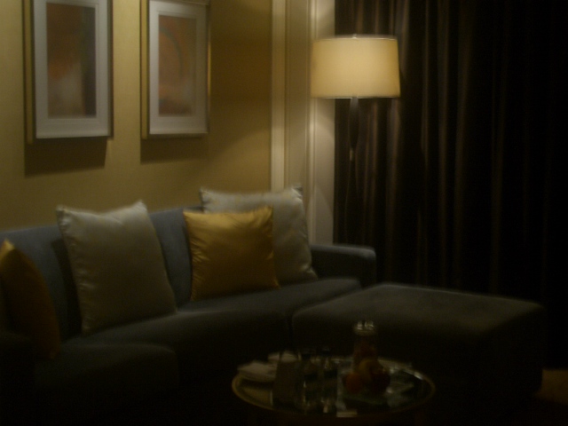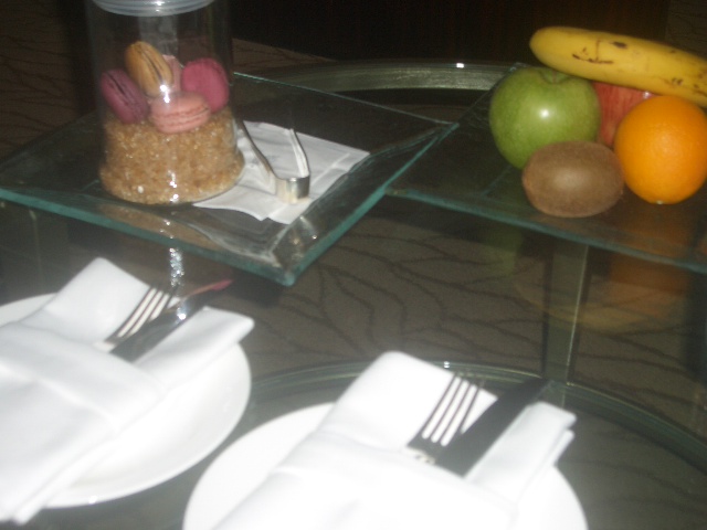 ソファーもかなりゆったりと大きく、テーブルにはフルーツ盛り合わせとマカロンのお菓子、ホテル自家製のチョコレートの詰め合わせが置いてありました。