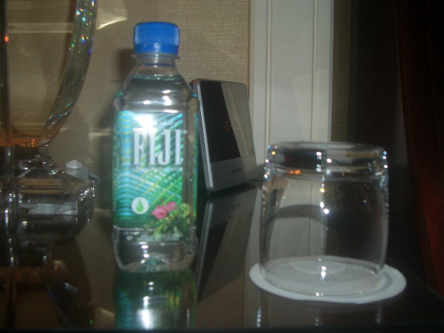 無料のミネラルウォーターのFIJIがテーブルに2本、ベットサイドテーブルにそれぞれに1本ずつ。
