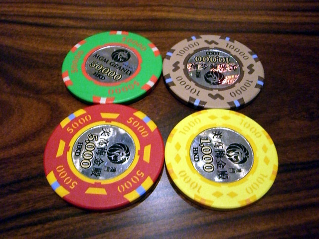 チップの色も100HK:黒、500HK:ワインレッド、1000HK:黄色とセブンラックに近い配色です。ちなみに5000HK:赤、10000HK:土色、50000HK:緑でした