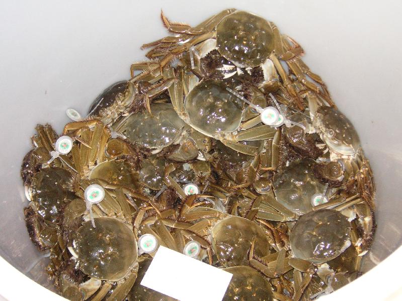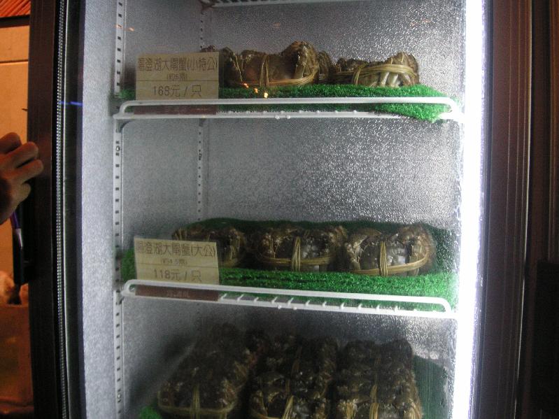 縦型ガラス張りの冷蔵庫の中に3段に分けられ並べられた上海蟹を見ます。