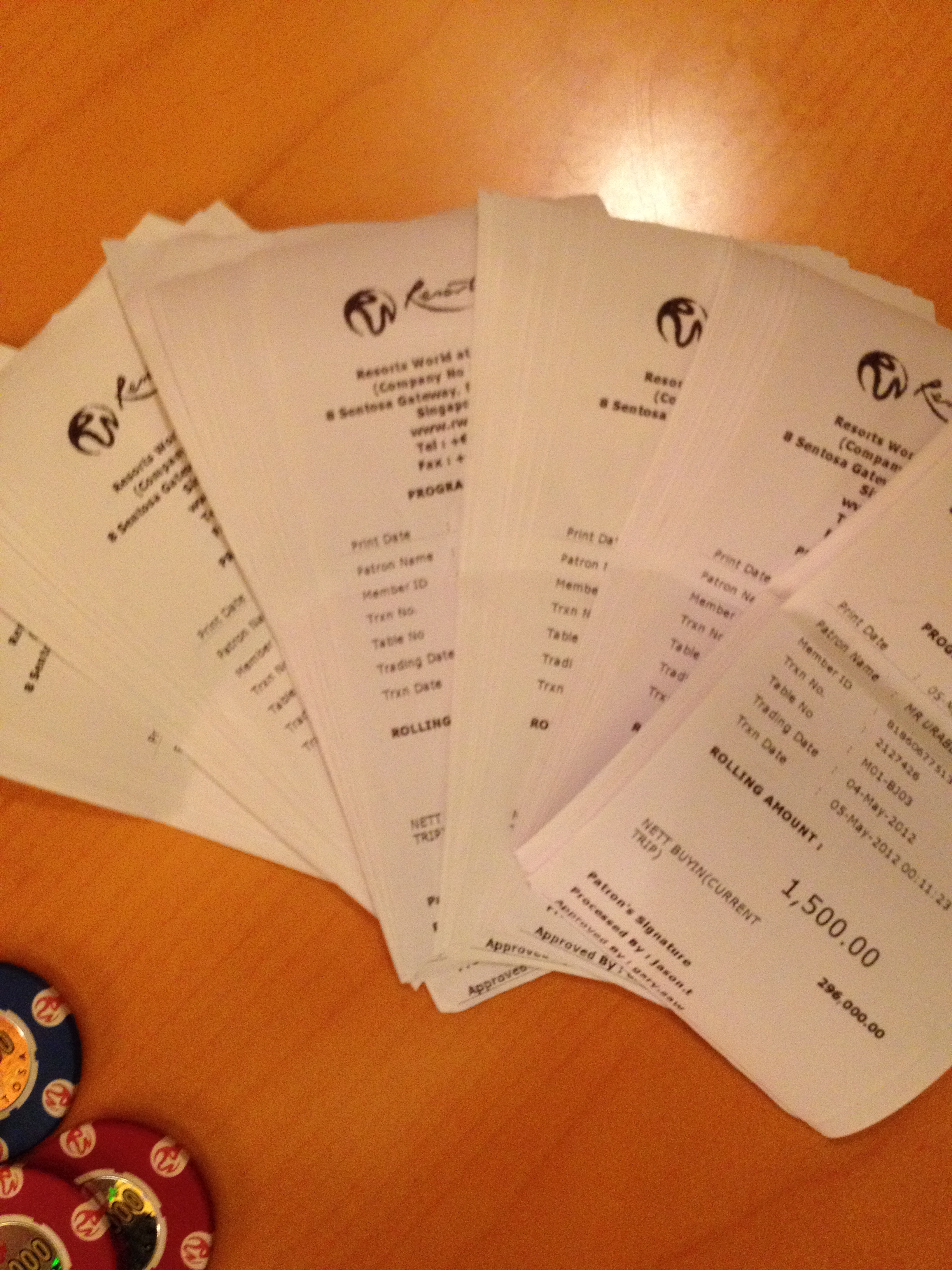 チップをカウンターに提出して、精算です。勝った金額は3500S$、後はローリング分のキャッシュバックで1700S$ほどもらいました。延べ30万S$分ほどのローリングをしていました(笑)部屋代はタダにしてもらい、ショーとUSSとオーストラリア料理のお金で800S$を支払いました。この戦果なら大満足です。