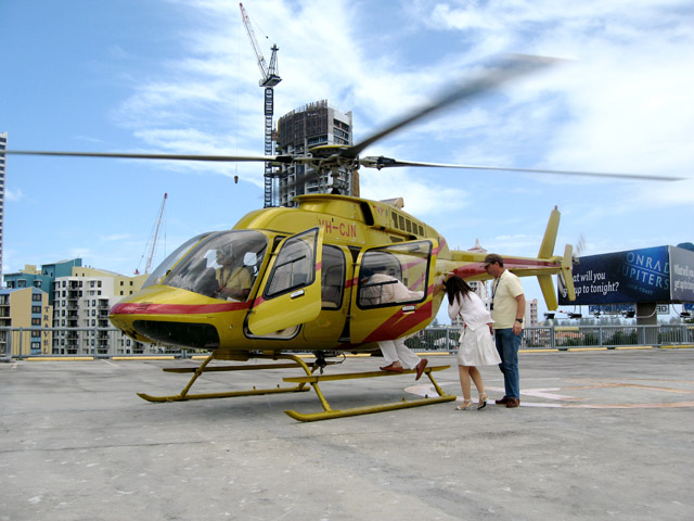 ゴールドコースト公式オフ会で最大のリゾ・イベントと言えば、このヘリコプター・ツアーだ。コンラッド・ジュピターズ併設の駐車場にあるヘリポートから出発し、水と緑に囲まれた美しいゴールドコーストの景観を上空から楽しむ。昨年のオフ会でも参加者から大好評だったこのツアーに、今回も12名の当選者が参加した。