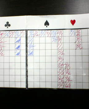 そこで私たちは作戦をたてた。ジミーさんが考えて私が乗る。ジミーさんがはずれたら、今度は私が考えてジミーさんが乗る、その繰り返しをしようと。そうしたら、負けたときは2人同時、勝った時はハウスだけの負けだ、それしかない!タイ1目はさんでのプレイヤーの7目ツラから始まった。ほとんどとったが、シューの最初ということで、大きく張れなかった、いつ落ちるか怖かったのだ。それからシューも進み、取ったり取られたり、死んだり生き返ったり、作戦どうり2人で絞りながらなんとか生きていた。ふとジミーさんのチップに目をやると残りわずかだ。最初以来ツラというツラは出ていない、3目か4目続けばいいほうだ。シューの終盤にそれはやってきた!プレイヤーが2目起きた。その前はバンカー2目、その前はプレイヤー1目。ここで、この罫線でプレイヤーが下に伸びると思うことがどうしてもできなかった。きっと他の人でもそう思うだろう。しかし、下に伸ばすしかないのだ。ジミーさんに確認をとる。「気合でのばしましょう!、ここからは希望です!」とジミーさんに励まされた。