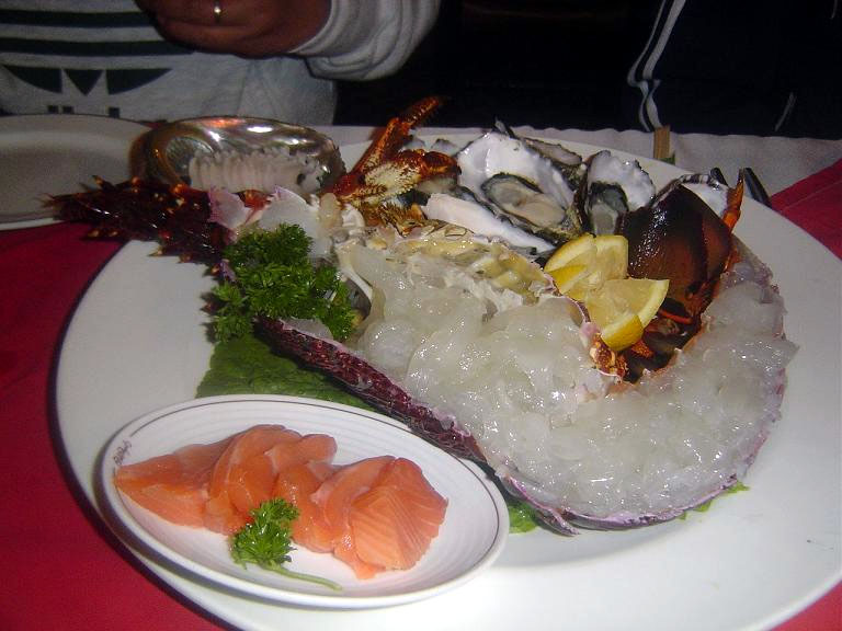 ブルーエンジェルという店のロブスターコースをいただきました。日本ではうん万円はするかという海老です!あわび、かき、おそろしい量のコースです。
