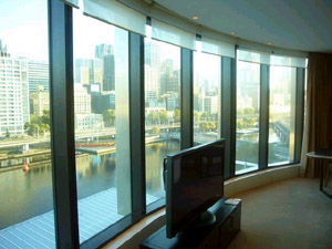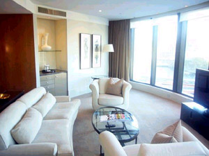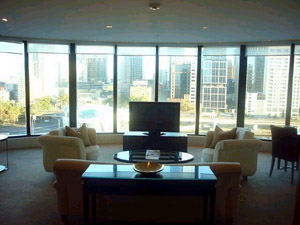クラウンタワーズそのものもオーストラリアの最高級ホテルの基準となるホテルとも言われるくらい格の高いホテル。その中でもとくにご紹介したいお部屋は、99平米もあるdeluxe suites。5階から26階の両端にあるお部屋ですが、もちろんヤラ川サイドが断然おすすめ。部屋に入ったとたん180度以上広がるヤラ川と高層ビル群には圧倒されます。夜には川沿いに演出される炎とフリンダース駅のライトアップをはじめとする見事な夜景が素晴らしい!大理石を使ったジェットバス付きバスルーム、42インチプラズマディスプレイのTV、高級オーディオなど設備も抜群(プレステも備え付けあります)。