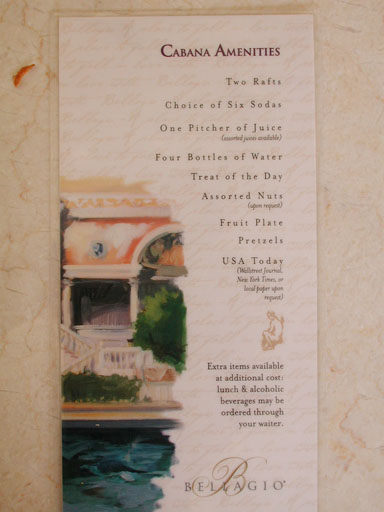 ●カバナが最高。ミストが吹き出し、目の前にはジャグジー。大人5人でも十分なスペース。15分ごとにアテンダントが「何か御用は?」と聞きに来ると、まるで貴族気分。ジュース・フルーツが冷蔵庫にたんまり(無料)。これで一日100$は安い!!ぜひご家族、カップルの方は体験してみてください。(五代さん曰く、マンダレイベイはもっと豪華だとか)