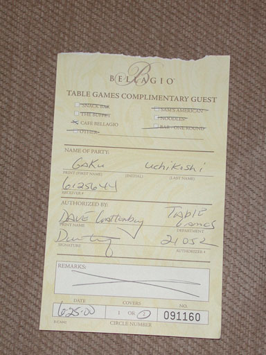●五代さんと会うまでは、1$もベットしないぞと決めていたにも関わらず、モンテでBJテーブルへ(結果はまた別のレポートでお知らせするが、ディーラー強し、エアコンさらに強し。寒々とした中ベラージオへ帰還)