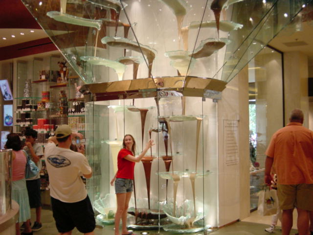 また、ホテルロビーに隣接する中庭の裏側、モノレール乗り場に向かう途中においしそうなスィーツの店がありました。そこには、なんとチョコレートの滝が。。。。本来ならチョコレートフォンデュでもして食べたいところですが、ガラスで覆われていたのでみなさんもっぱら記念撮影。一度見に行ってください。