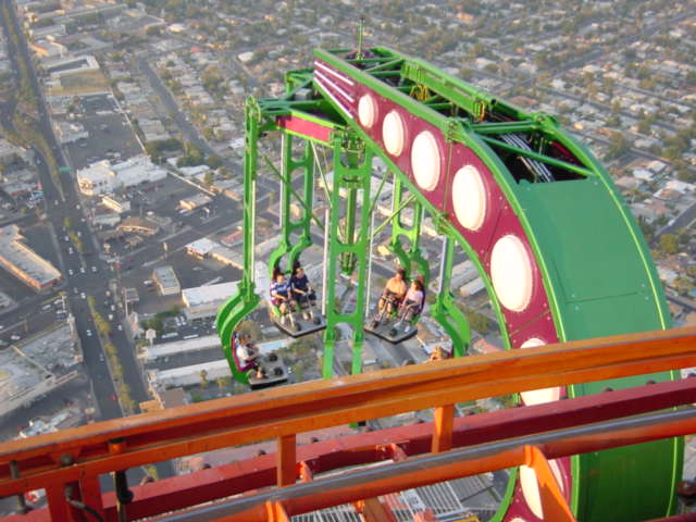 ●ストラスフィア・・・チキン・カジ郎は、昔スカイダイビングをした経験があるのに、グランドキャニオンに恐怖のセスナフライトしてから高いところが苦手になってしまいました。で、カジ郎は展望台に登るのが精一杯。私の代わりにUさんとまゆかんさんが果敢にローラーコースターに挑戦していただきました。でも、展望台揺れるんですよ。ほんとに。