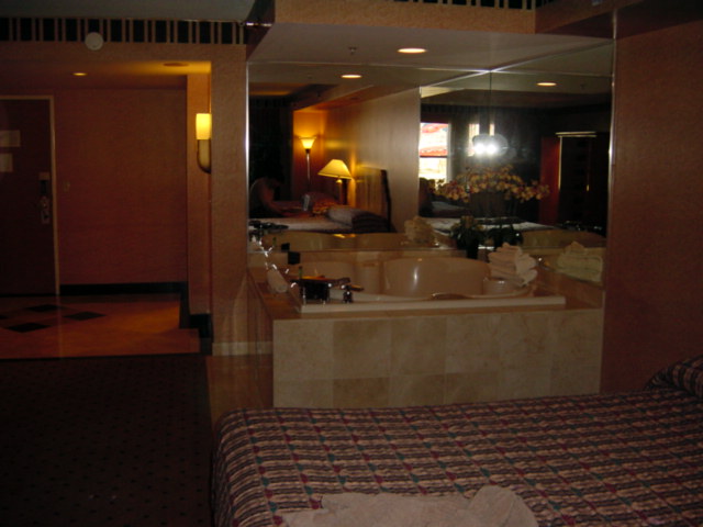 ●チェックインタイムよりかなり早めに到着したため部屋が用意できていない。何とか都合を付けてもらったが、私とNOBUさんの部屋はニューヨークタワーの4Fで窓の外はカジノ棟の屋上。マンハッタンエクスプレスがゴトゴトと音を立てている。「マスターとGAKUさんの部屋は高層階やったな。ストリップとか砂漠がキレイやろな。ま、お2人にはいろいろ世話になってるから、しゃあないか」ただ、さすがにジャグジー付マルキスルームは広い。大の男2人でもユッタリ。