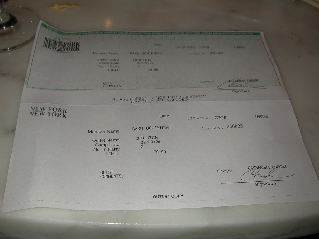 その後もしやと思い、テーブルゲームのピットボスに直接フードコンプチケットを交渉したところ、$60分くれたりしましたので、カジノホストとピットボスのコンプの決済は別物なのだな、と実感しました。(実はその後も調子に乗ってフードコンプチケットを2回ばかりもらいました。もちろんプレイの後ですけど。)